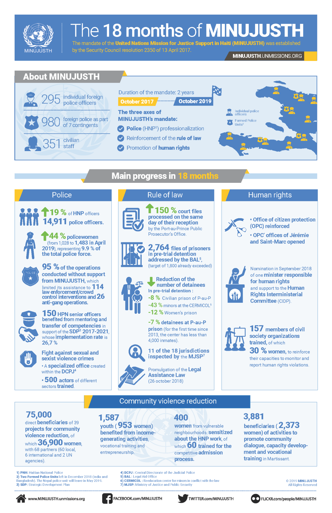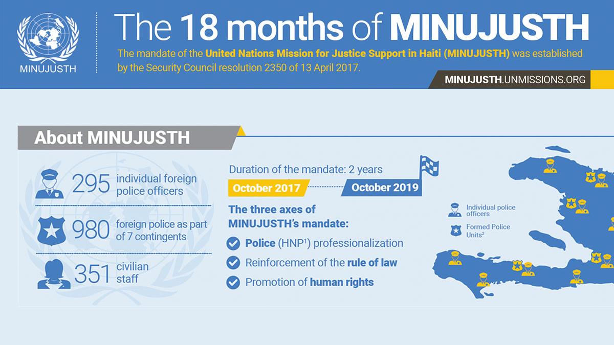 The United Nations Mission for Justice Support in Haiti (MINUJUSTH) will close on 15 October 2019, marking the transition towards a United Nations’ presence in the country without a peacekeeping operation. The Security Council has authorized a final six-month extension, as scheduled, to complete a mandate focused on three pillars: Rule of Law, Human Rights and Police. On this occasion, the mission takes stock of the progress made by Haiti during the last 18 months under the umbrella of its partnership with MINUJUSTH.