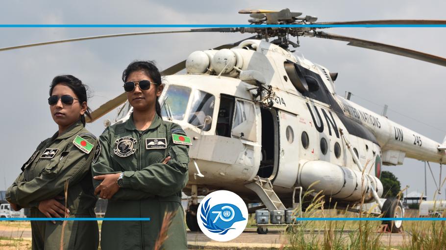 In 2017, Bangladesh, long one of the largest contributors to UN Peacekeeping, deployed women pilots for the first time when they sent Flight Lieutenants Nayma Haque and Tamanna-E-Lutfi to serve with the UN Organization Stabilization Mission in the Democratic Republic of the Congo (MONUSCO). Here, the two officers stand proudly in front of their helicopter.