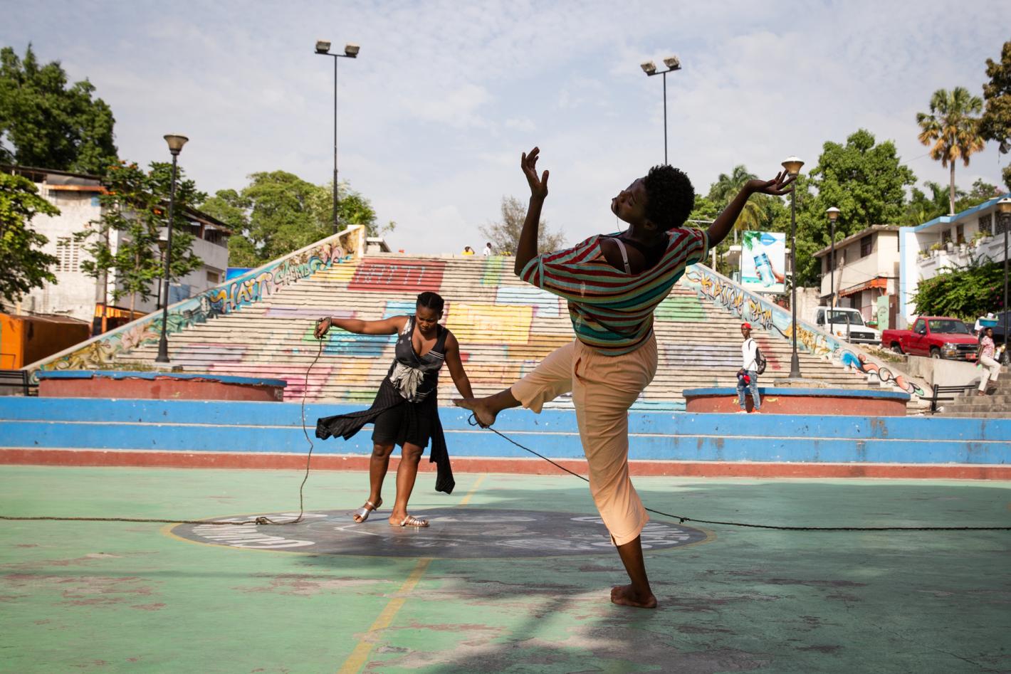Tuesday 5 June. 6 pm. At Place Jérémie (Port-au-Prince) 34 dancers, accompanied by percussion players gather for a street performance. Aged 16 to 20, these youngsters start contemporary dance moves, following the Port-au…