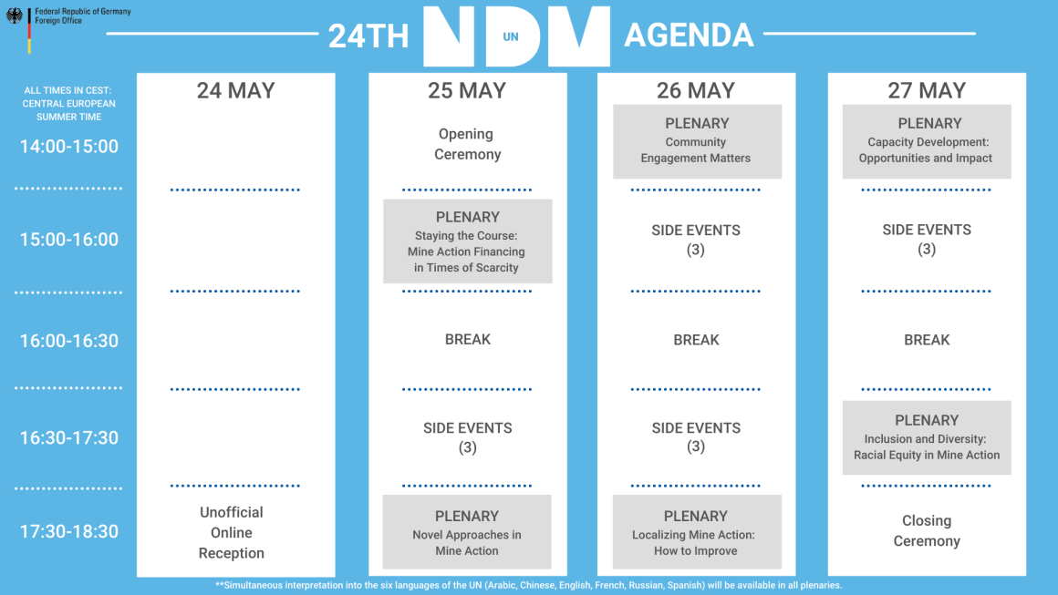 The 24th International Meeting of Mine Action National Directors and United Nations Advisers (NDM-UN) was held from 25 to 27 May 2021. UNMAS would like to thank the Government of the Federal Republic of Germany for the generous contribution making this event possible.