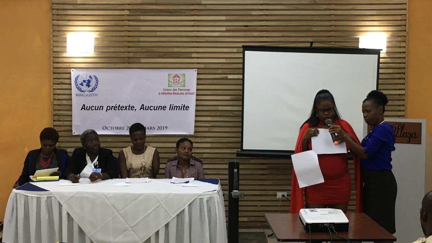 Dans le cadre de son mandat et tenant compte de sa stratégie de sortie, la Mission des Nations Unies pour l’appui à la Justice en Haïti (MINUJUSTH) a soutenu, à travers sa section des droits de l'homme, un projet de réduction de la violence communautaire (RVC). Ce projet, présenté par l’organisation l’Union des Femmes à Mobilité Réduite d’Haïti (UFMORH) et lancé le 29 octobre 2018, à Port-au-Prince, a pour but de promouvoir le respect des droits humains et l’inclusion des personnes à mobilité réduite. « Aucun prétexte, aucune limite » : c'est toute l'ambition de ce projet qui sera mis en œuvre à Cap-Haïtien et à Port-au-Prince sur une période de 6 mois.