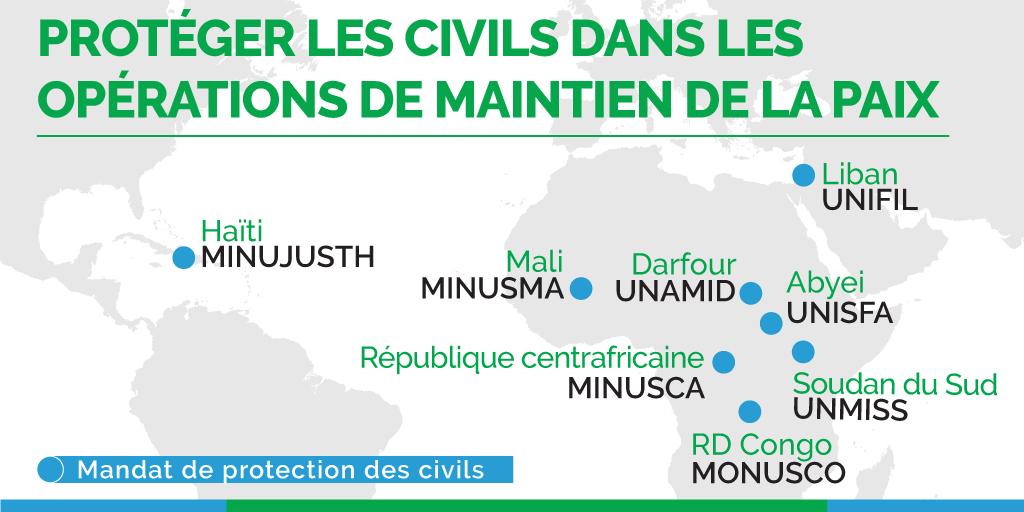 Le plus souvent déployés dans les zones où les populations civiles sont le plus en danger, les Casques bleus de l’ONU protègent les personnes les plus vulnérables dans les conflits, notamment les populations déplacées ou celles qui fuient leurs maisons, ou qui sont menacées en raison de leur religion, de leur âge, de leur appartenance ethnique ou de leur sexe. Les Casques bleus s’acquittent de cette importante tâche dans des environnements de plus en plus complexes : MINUJUSTH (Haïti), MINUSCA (République centrafricaine), MINUSMA (Mali), MONUSCO (République démocratique du Congo), MINUSS (Soudan du Sud), MINUAD (Darfour), FINUL (Liban), et FISNUA (Abyei).