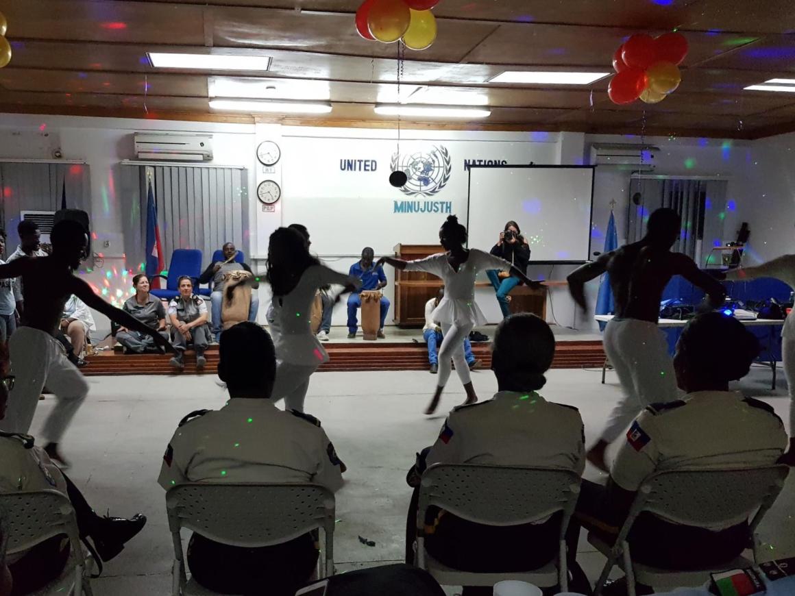À travers un mélange d’arts scéniques (déclamations, danse, mime et théâtre), RECIF-Création, un partenaire de la MINUJUSTH composé de jeunes qui ont d’ailleurs reçu de la Mission des séances de formation sur la thématique VBG, a mis à contribution les talents et la sensibilité de ses membres sur ce sujet. Ce, dans l’objectif de donner un coup de projecteur sur les dures réalités que supportent les femmes haïtiennes pour obtenir un emploi, pour accéder à de grandes études, pour participer et s’imposer en politique, pour dénoncer les pratiques de harcèlement, de discrimination et de violence dont les femmes sont victimes, inviter et sensibiliser sur les changements nécessaires pour le respect des droits des femmes.