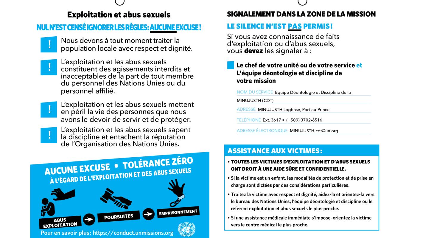 Les Nations Unies ont une triple stratégie pour éradiquer l'exploitation et les abus sexuels. Les trois volets sont la prévention, l'application stricte des normes de conduite des Nations Unies et l'assistance aux victimes. Dans son allocution le chef de la composante de police a notifié aux différents responsables présents à cette rencontre leur obligation de sensibiliser à leur tour leurs personnels en leur distribuant la carte de poche. « Comme son nom l’indique cette carte doit être en permanence dans votre poche, comme un rappel de vos obligations et interdictions » a souligné le Général Monchotte. Les cas d’exploitation et d’abus sexuels sont des violations graves des droits de l'homme. Ils sont contraires aux valeurs et aux efforts de l’Organisation en appui des autorités et du peuple haïtien. « Il appartient à chacun de nous de les bannir et de donner le bon exemple » a conclu le Général.