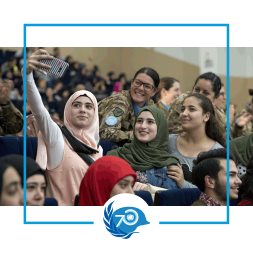 Les femmes Casques bleus déployées à travers le monde servent de modèles pour tous. Ici, des adolescentes libanaises se prennent en photo lors de la Journée internationale des droits des femmes avec des soldats de la paix de la Force intérimaire des Nations unies au Liban (FINUL).
